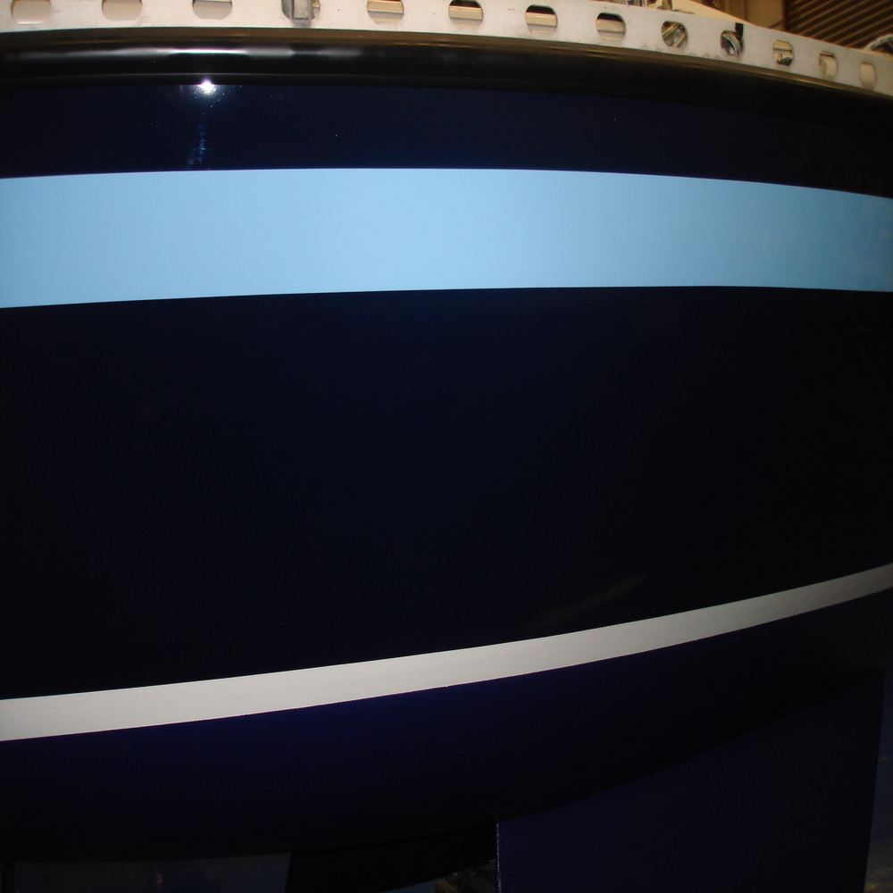 The topside were the sprayed with Awlcraft 2000, Flag Blue, this was allows to harden off for 2 days, we the re-taped in preparation to paint the light blue lines down the hull, the ine areas were sanded and prepper, the 5 coats applied of Awlcraft, SkyBlue was applied.