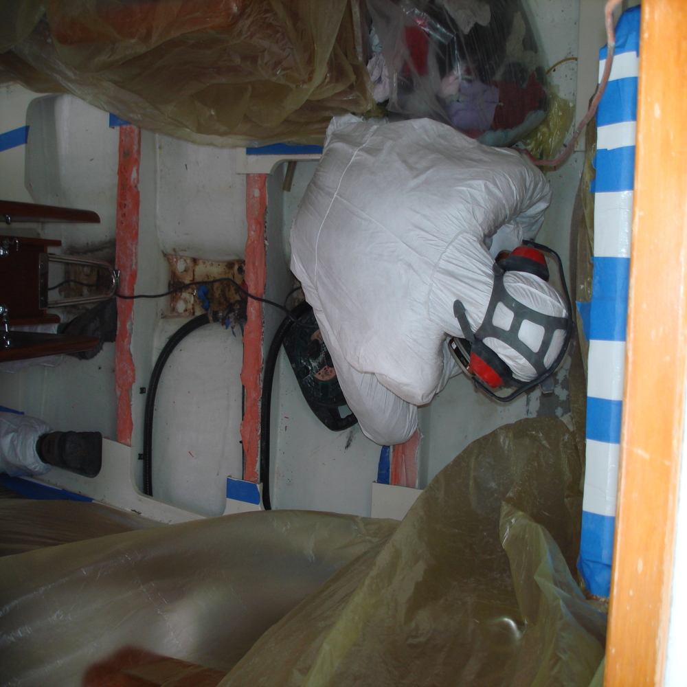 Tented the working area and grinded the hull back to good glass.