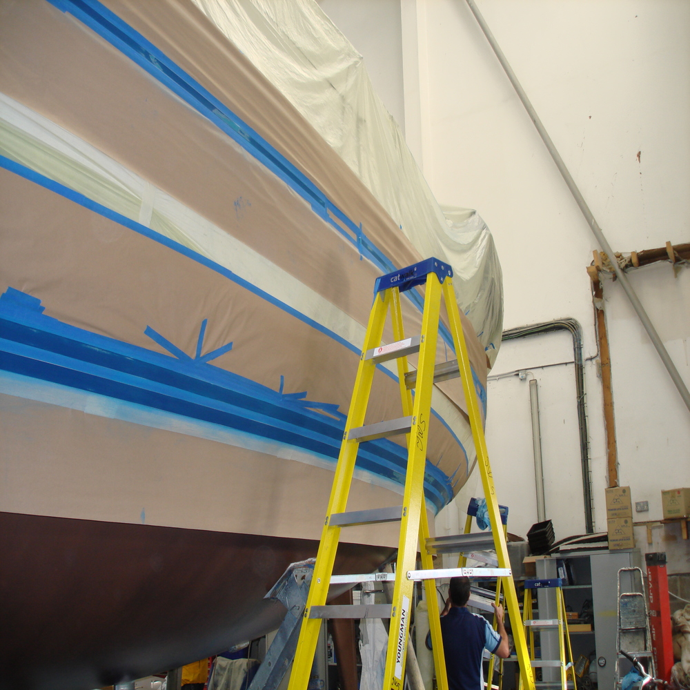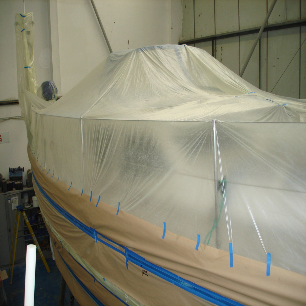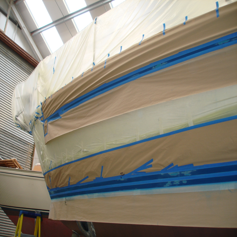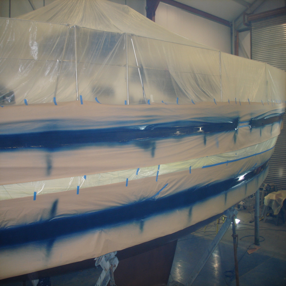 The hull was staged and the boat covered for any overspray, 1 cravita line and 2 waterlines were taped up.