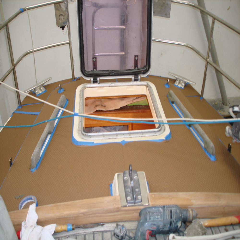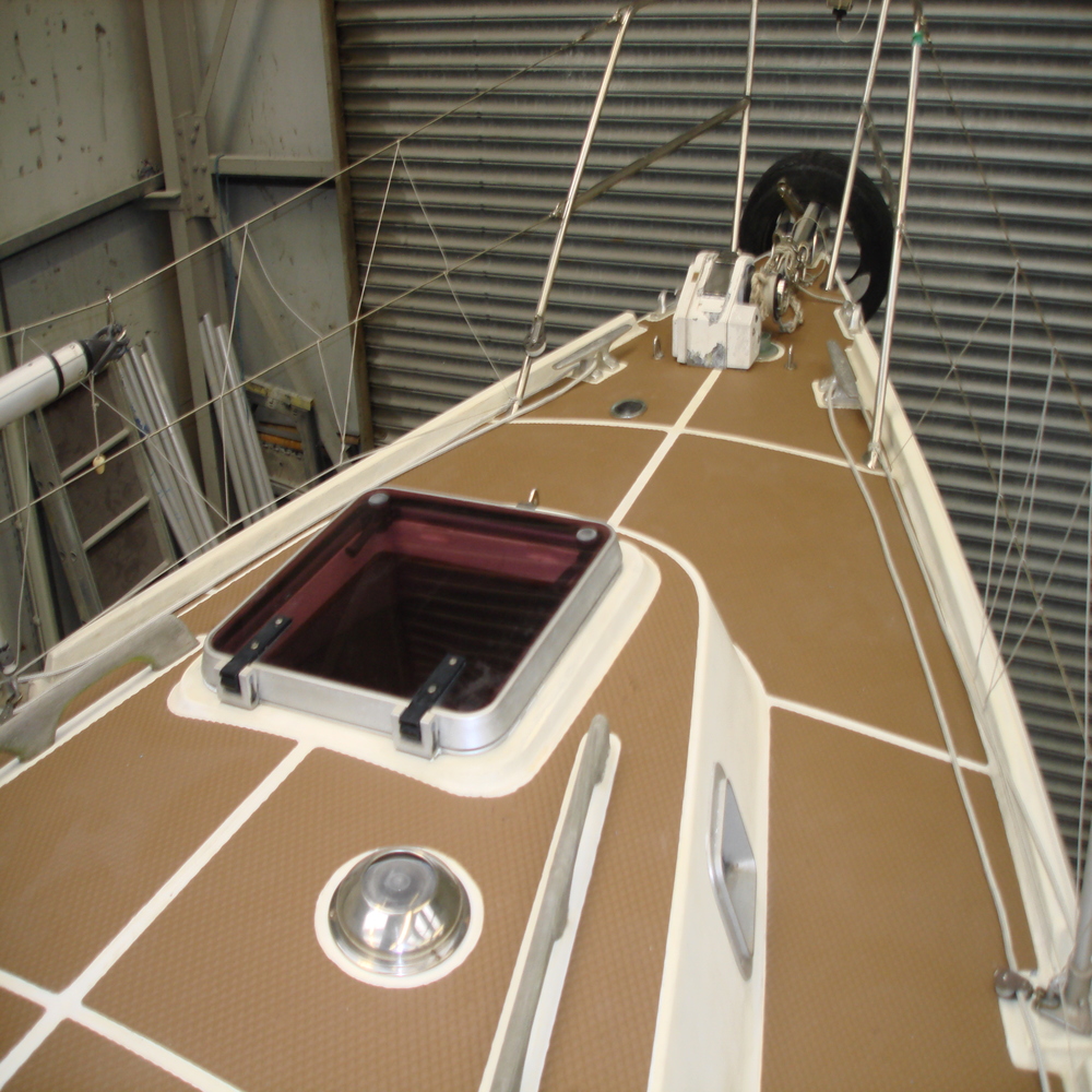 The tread on the deck was looking dull and faded, so first we gave all the tread a good clean with Treadmaster cleaner, we followed this up with the application of Treadcote paint, the colour used here was fawn.