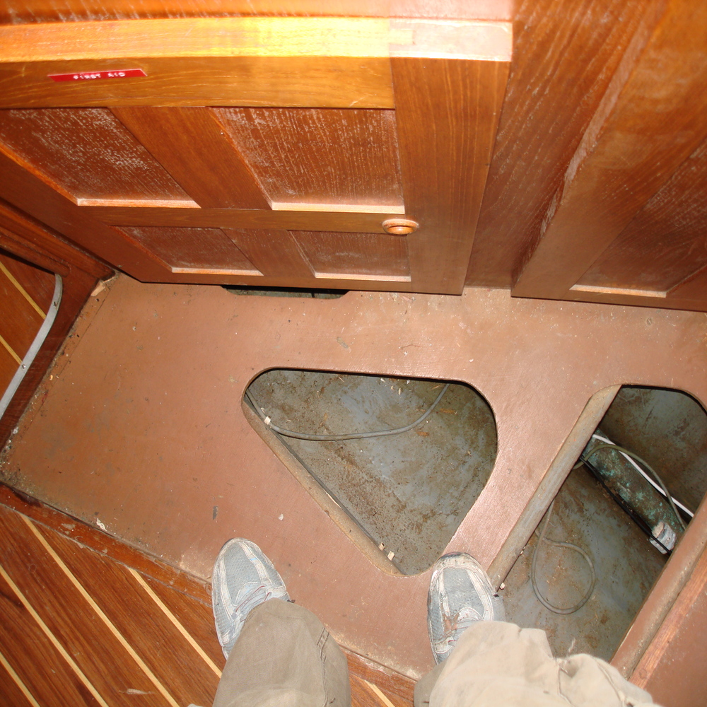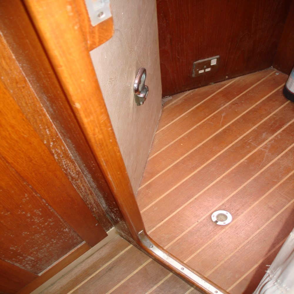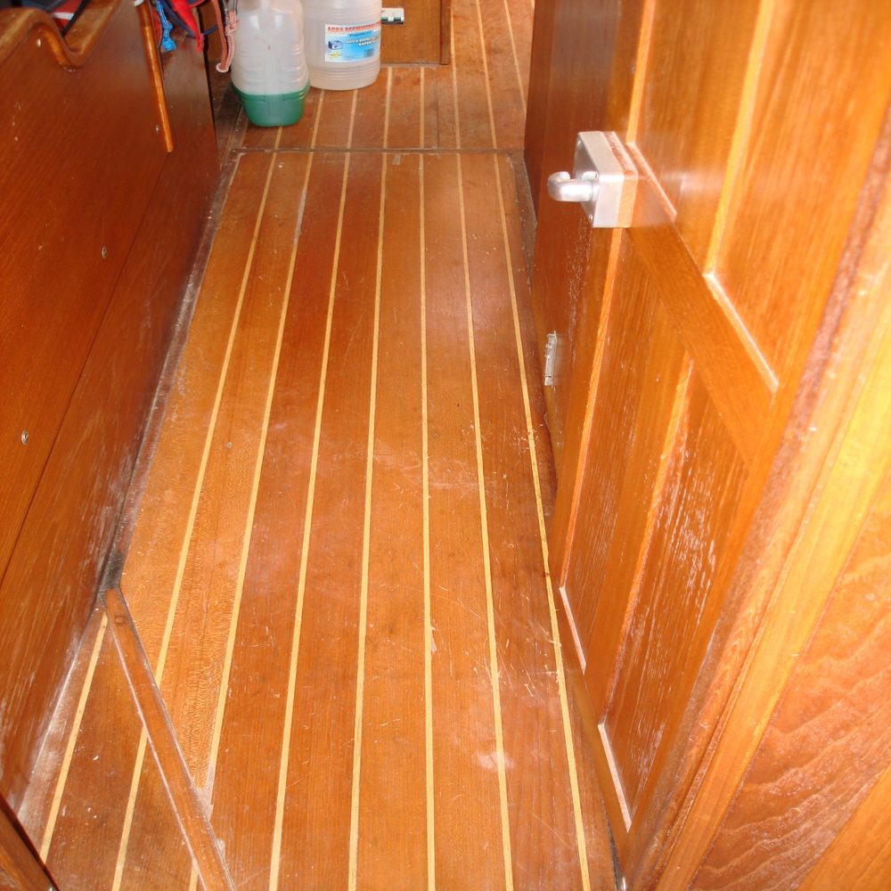 The flooring in the saloon and the cockpit stairs were in need of some TLC, so we removed all the loose flooring, taped up ready for sanding, sanded then applied 6 coats of varnish.