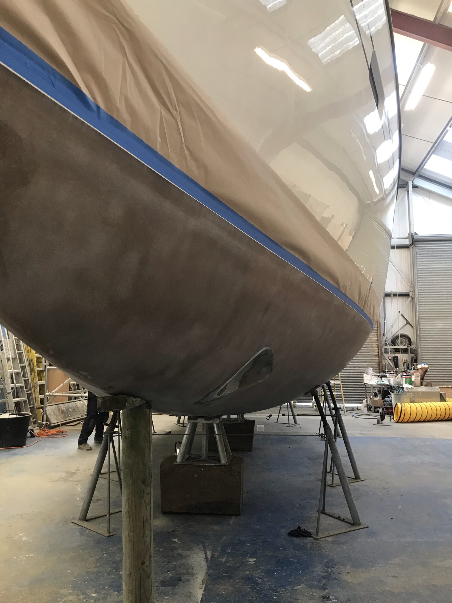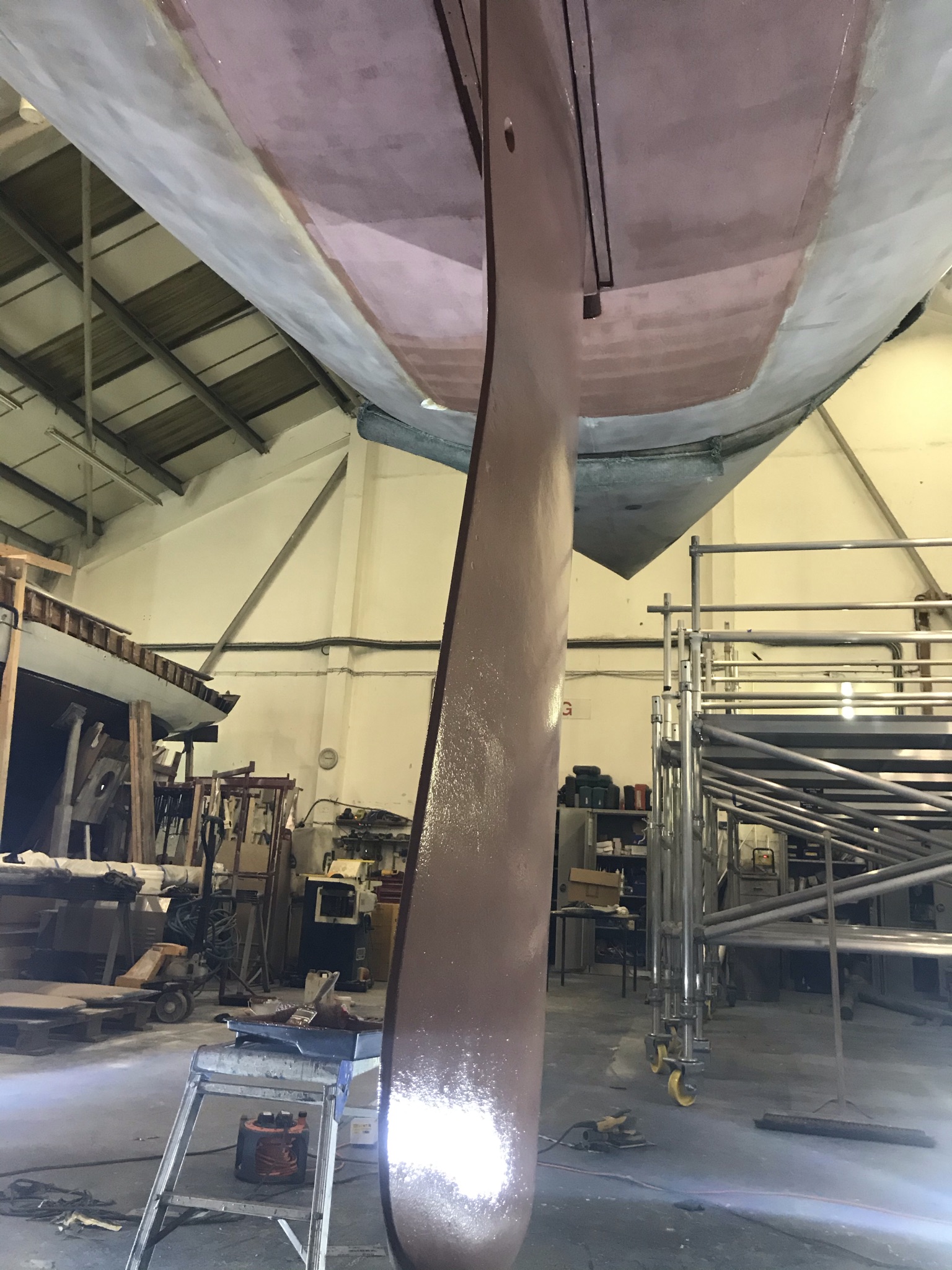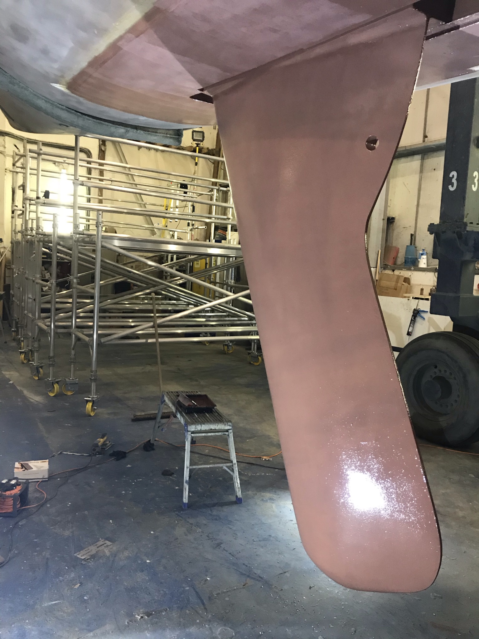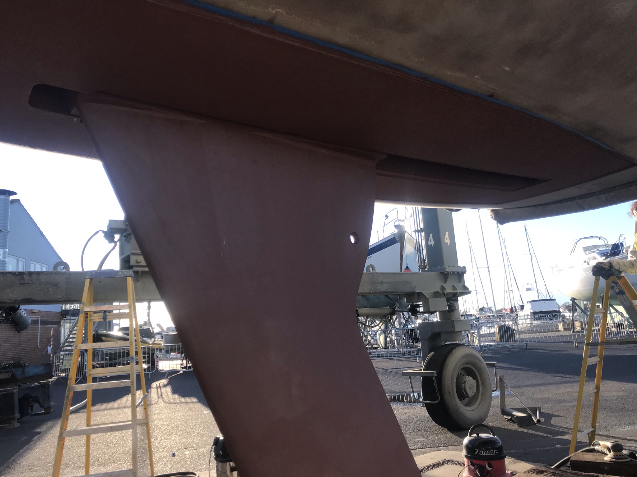 Next we prepped the hull and rudder for the Copper coat application, and applied 4 coats of Copper coat to hell and rudders, we also epoxied the keel as this was blasted along with hull.