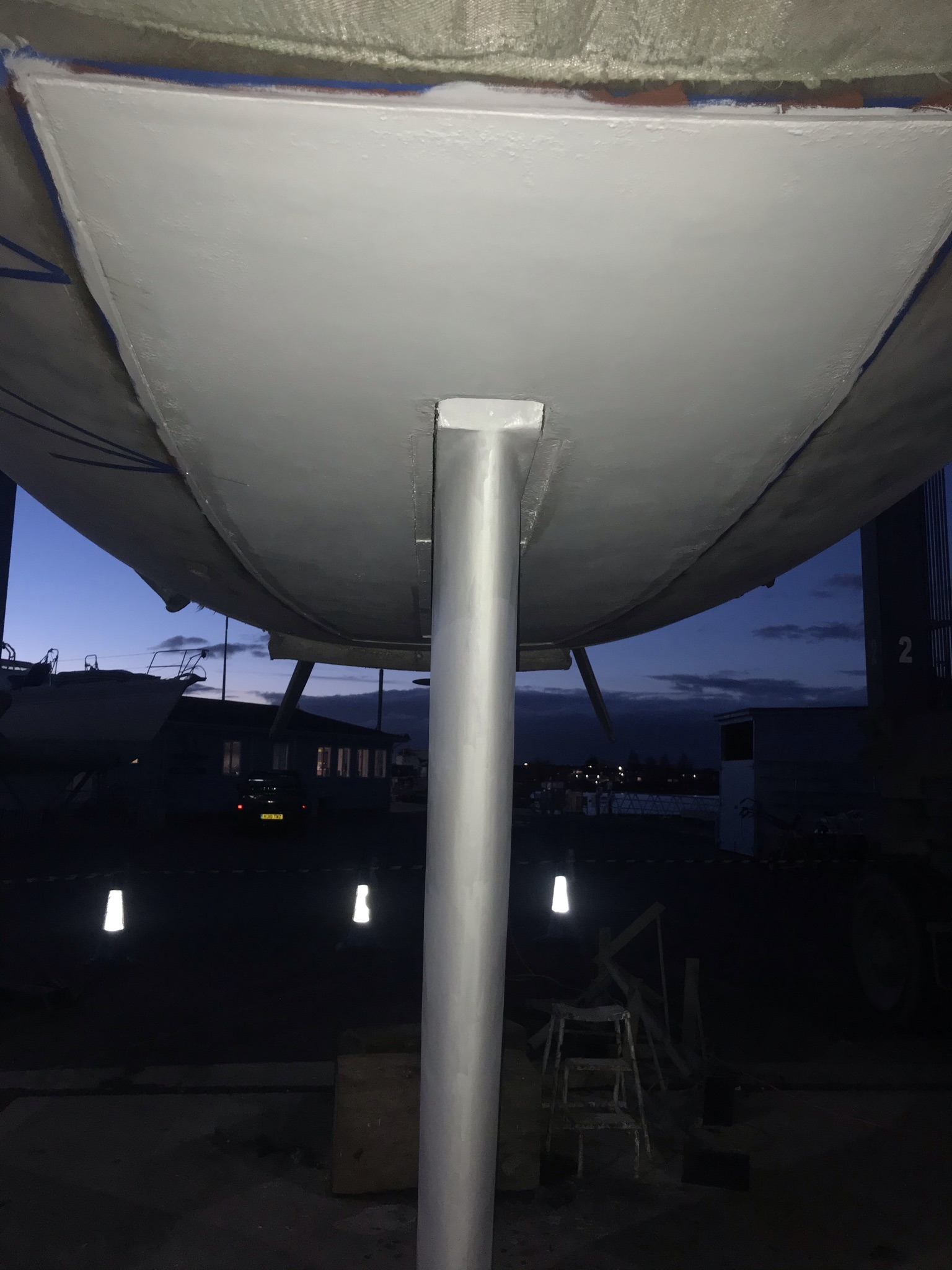 Once this was complete and her dry time over we grinded/sanded the drop keel and exposed plate area, applied 2 coats of ruster stopper, allowed for this to dry and applied a blast epoxy to all exposed areas, we allowed this to harden before placing her back onto the blocks.