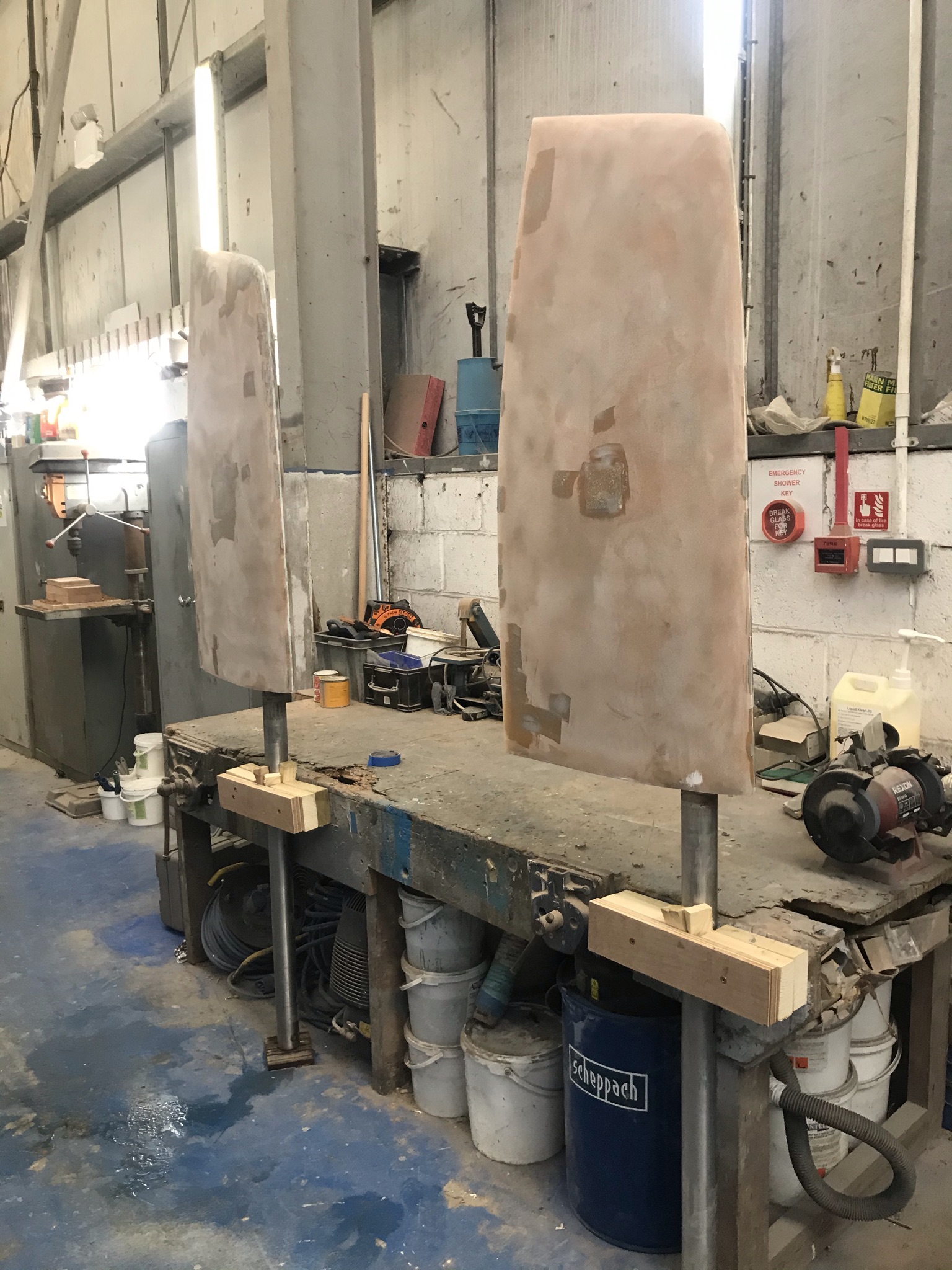 Cut all required laminates for inside and out, apply all laminates using polyester resin, clean up area.