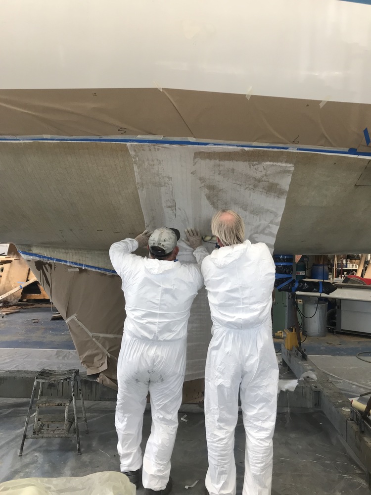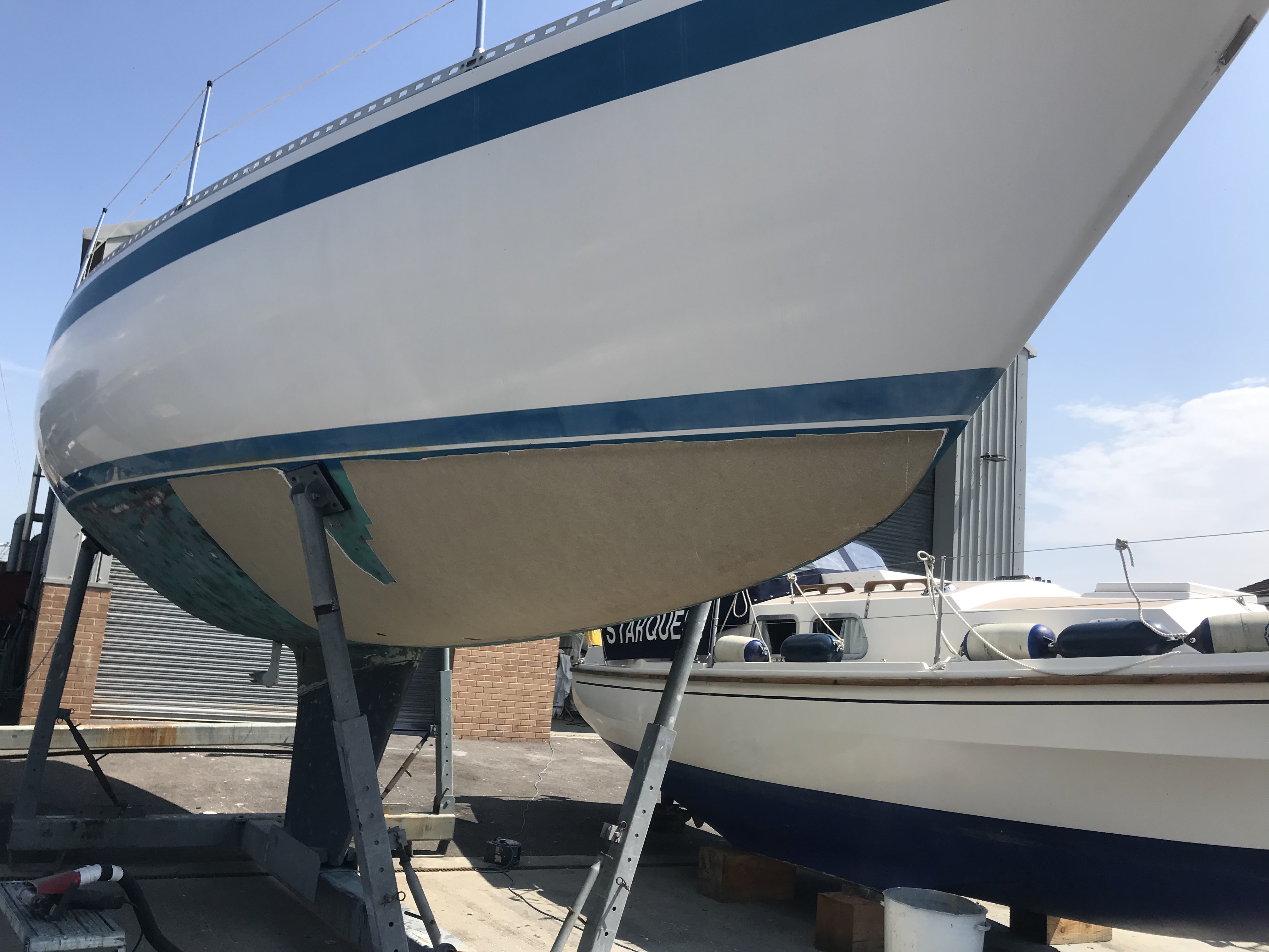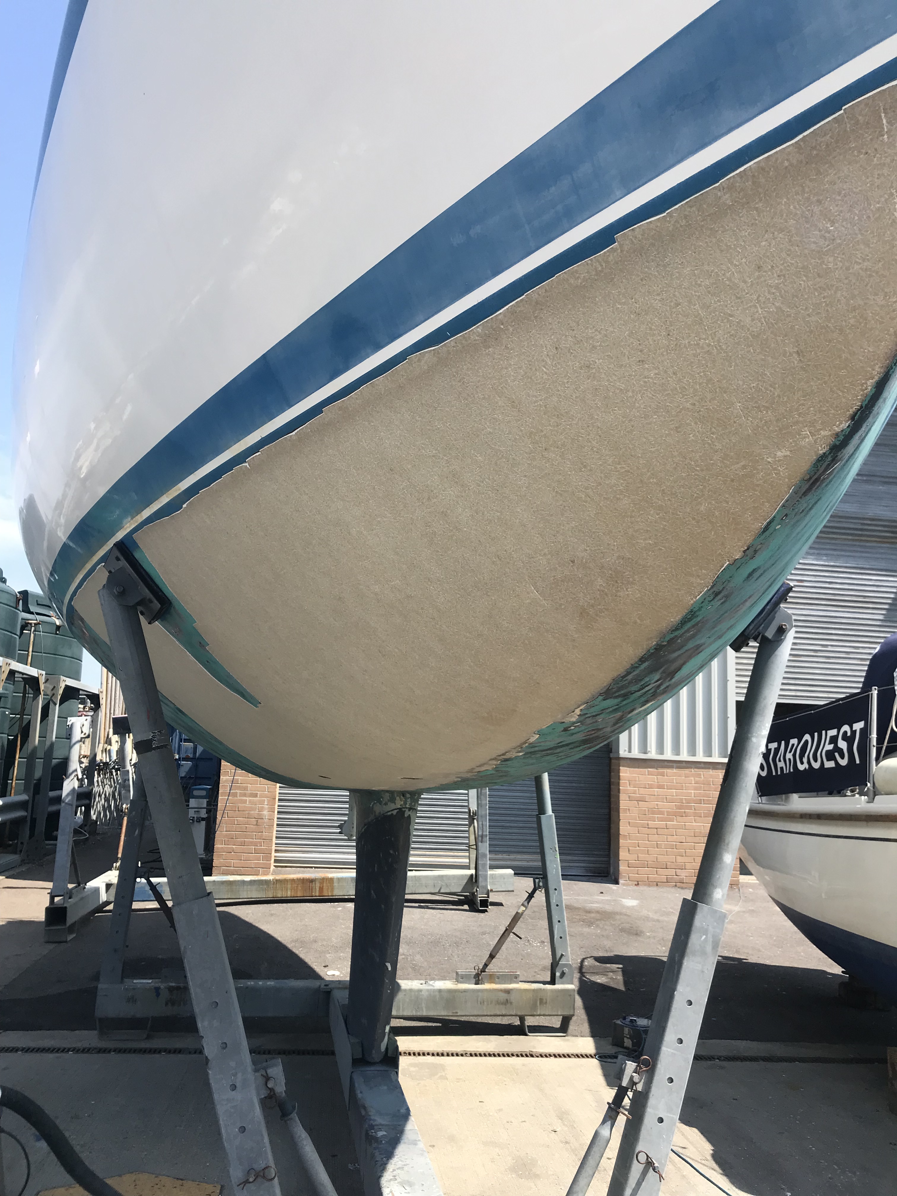 The boat is lifted so that the hull patches (Left from cradle) are sanded.