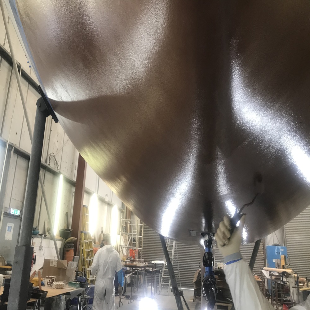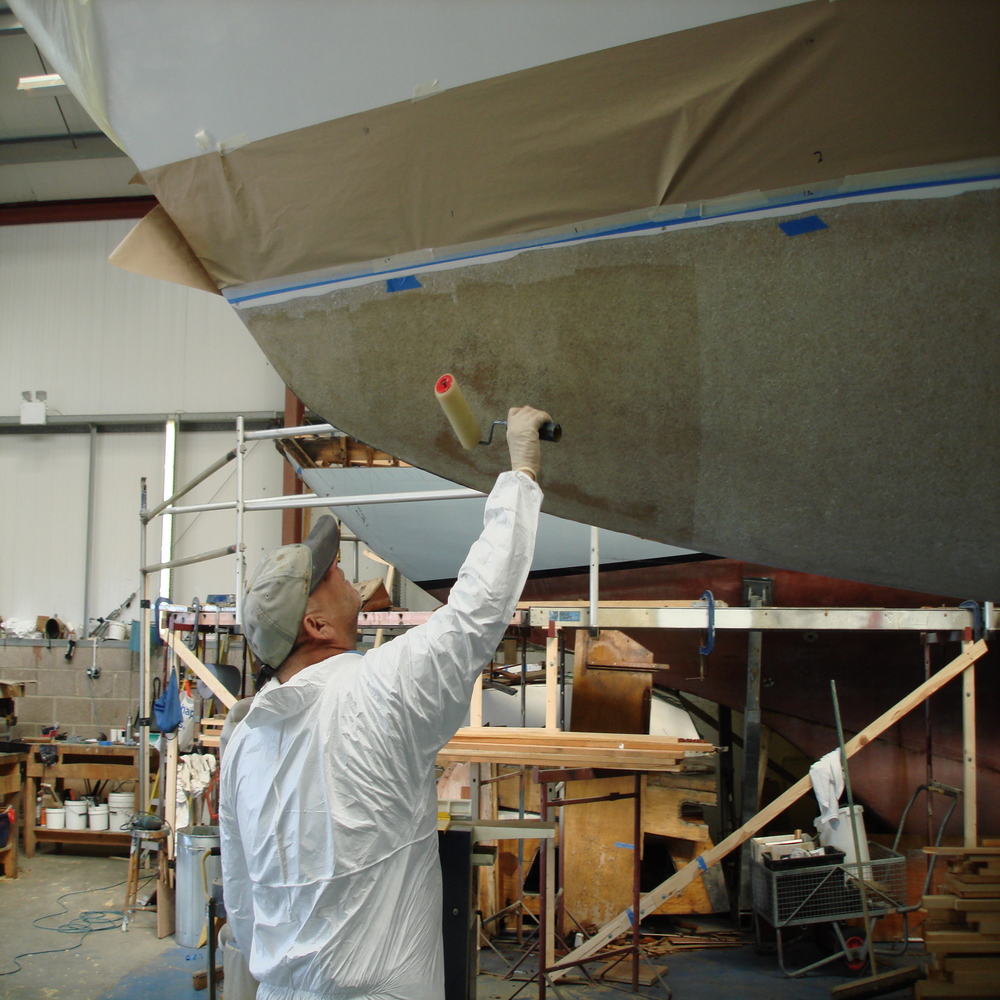 Due to the severity of the osmosis and the amount of materials removed during peeling etc we applied an additional layer of 292 tapered cloth, this was applied using Ampreg 30 resin and peel ply cloth before the Epoxy Megacote was applied.