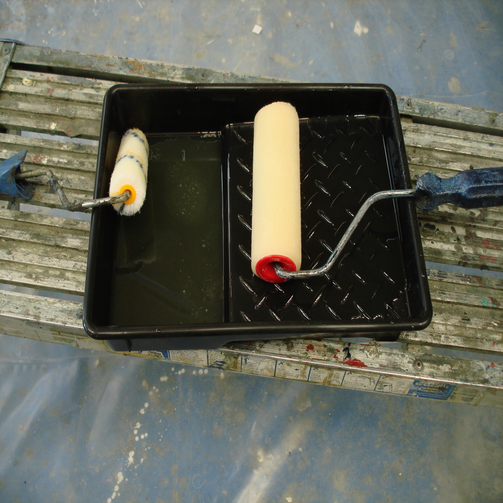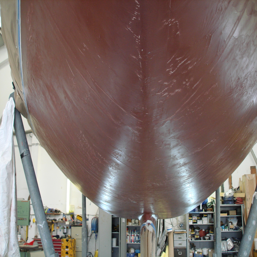 The hull is filled and faired, then the following 5 coats of Megacote is applied.