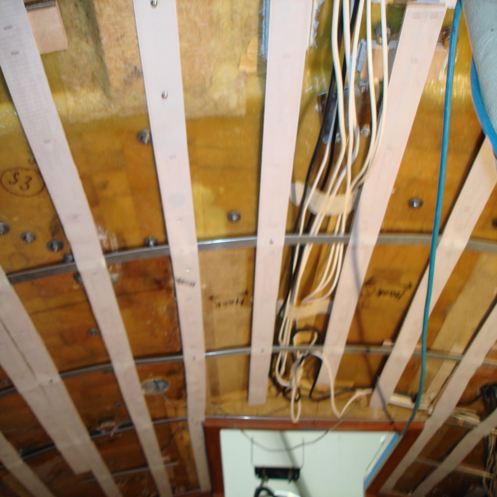 All surface areas were cleaned in preparation for the new headlining to go back up. Once up they were finished off with teak battening, varnished with 2 coats of Gloss varnish.