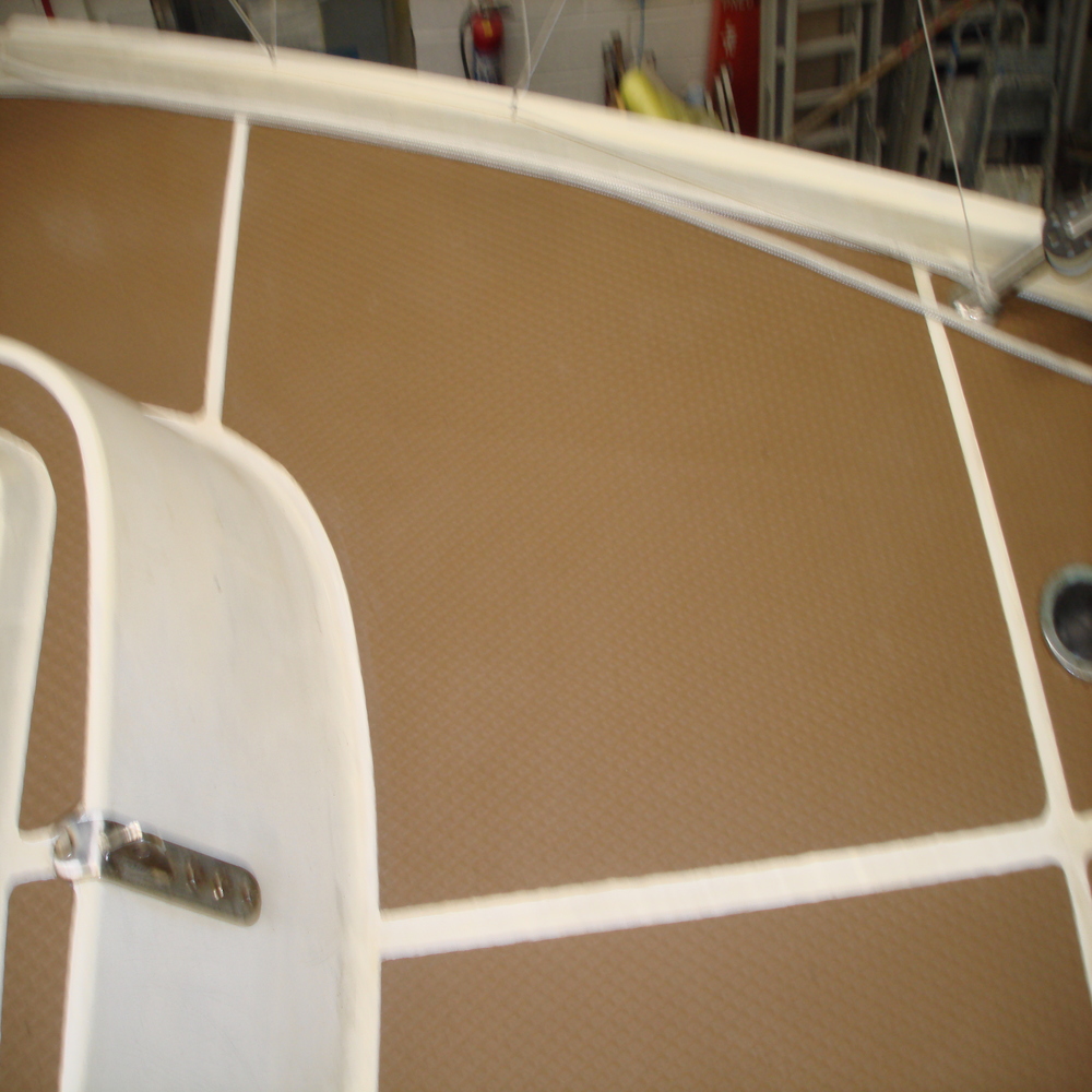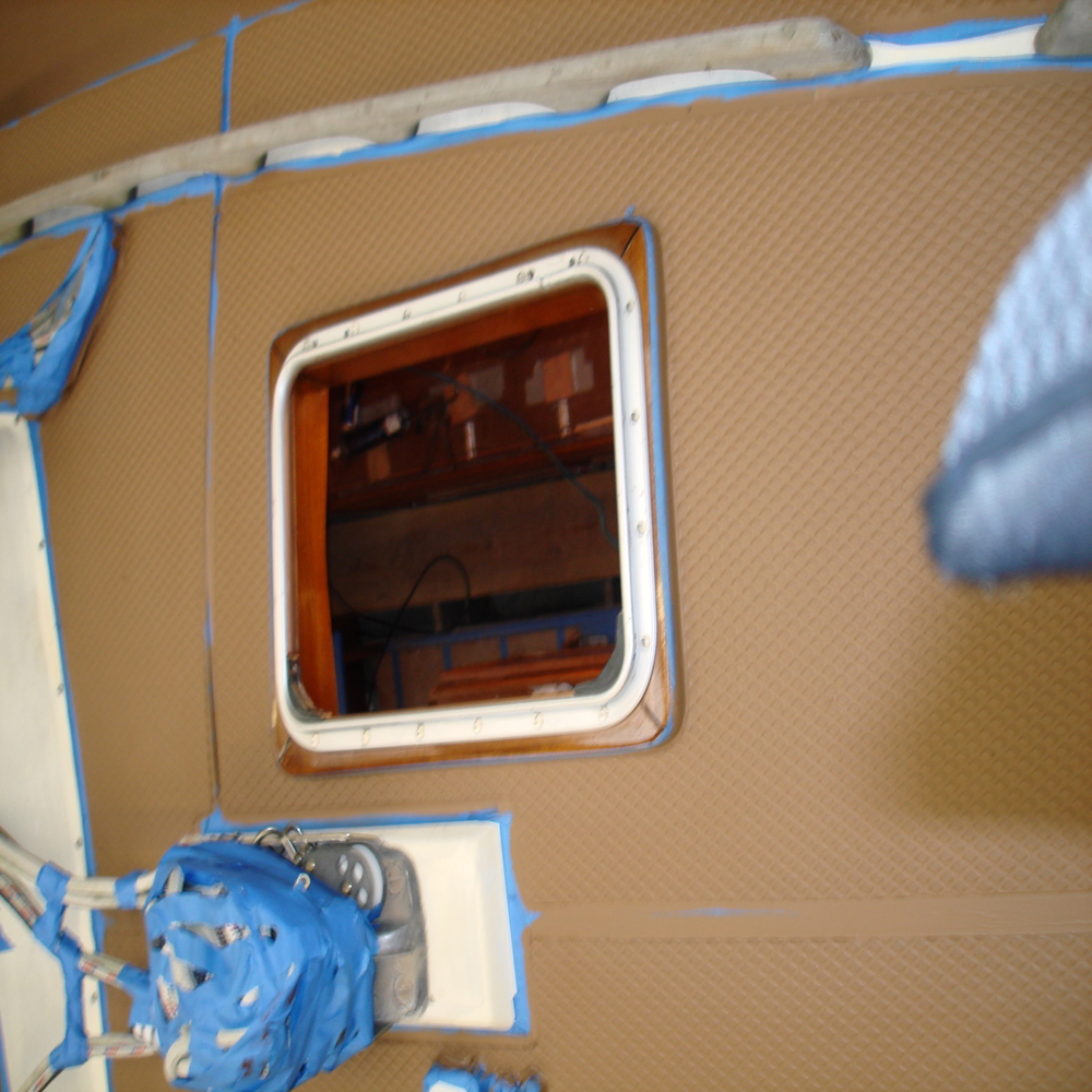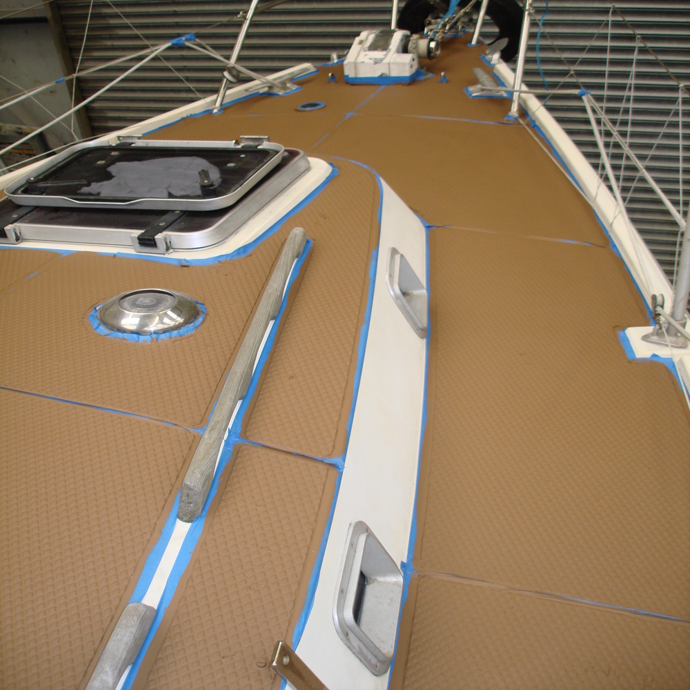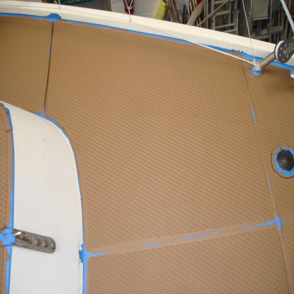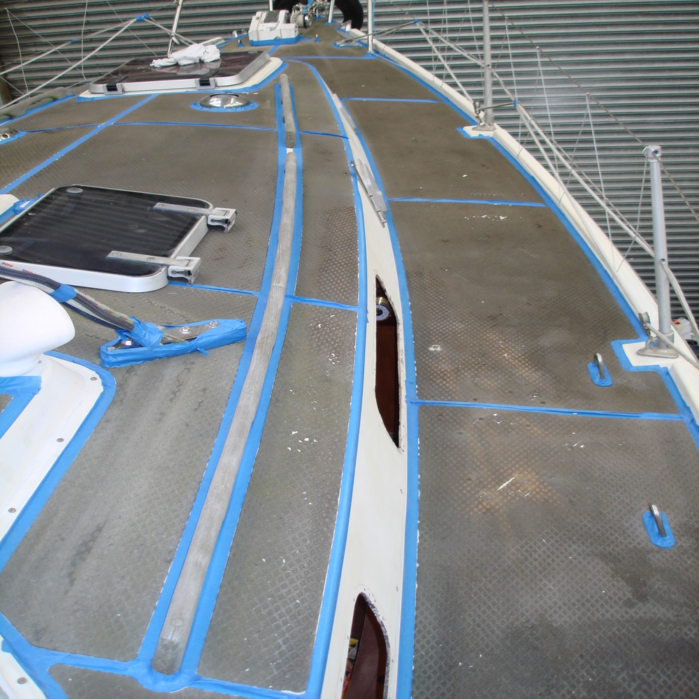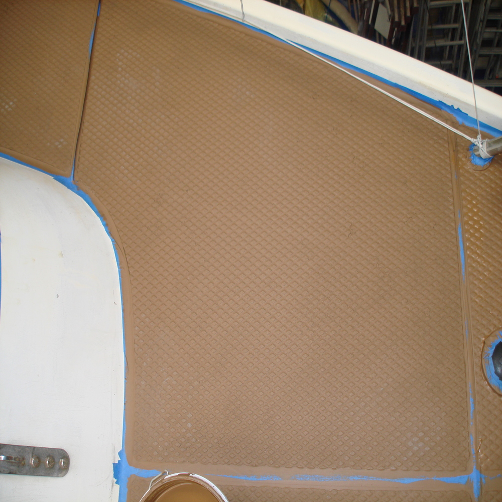 The tread on the deck was looking dull and faded, so first we gave all the tread a good clean with Treadmaster cleaner, we followed this up with the application of Treadcote paint, the colour used here was fawn.