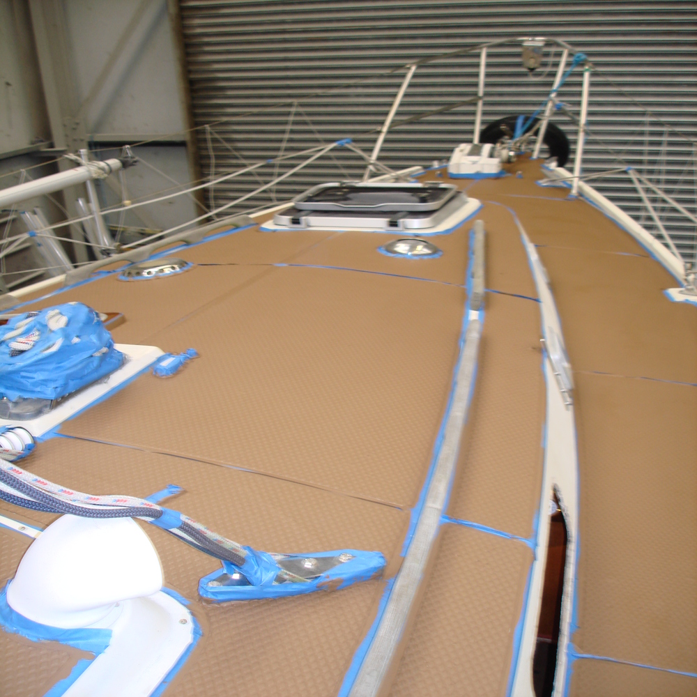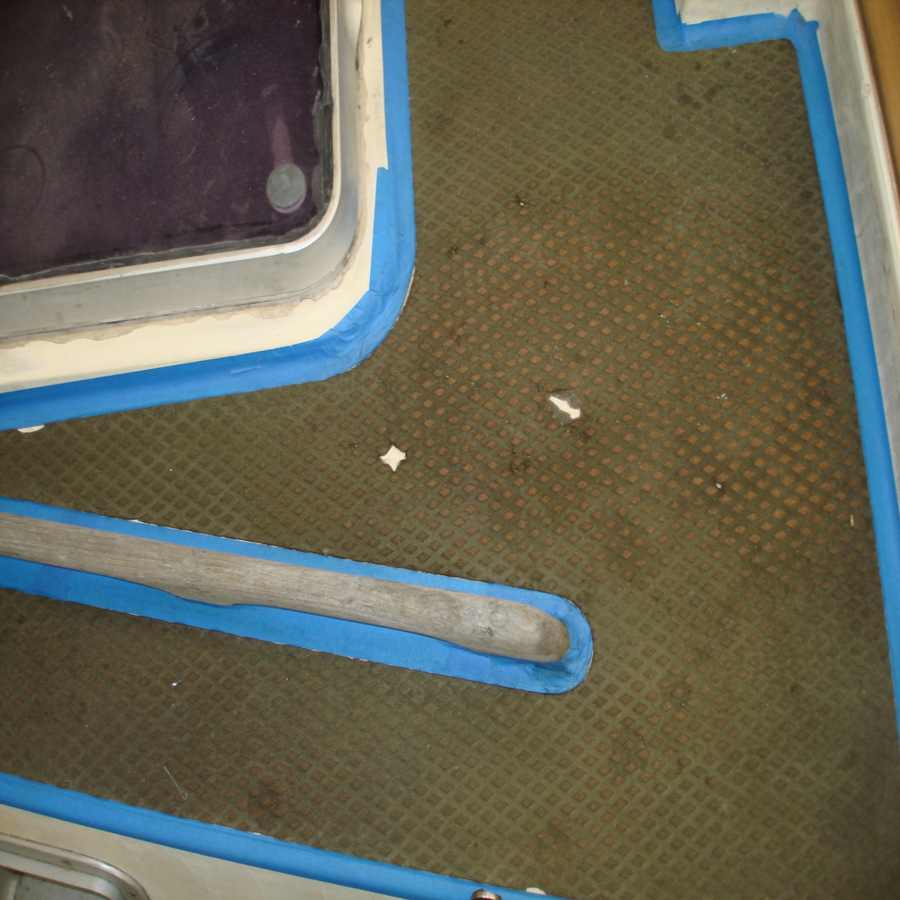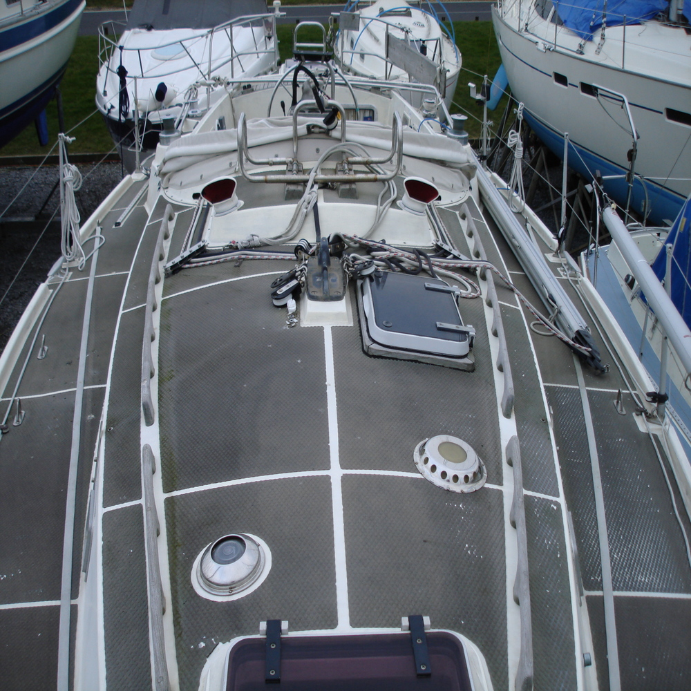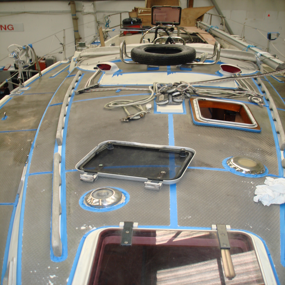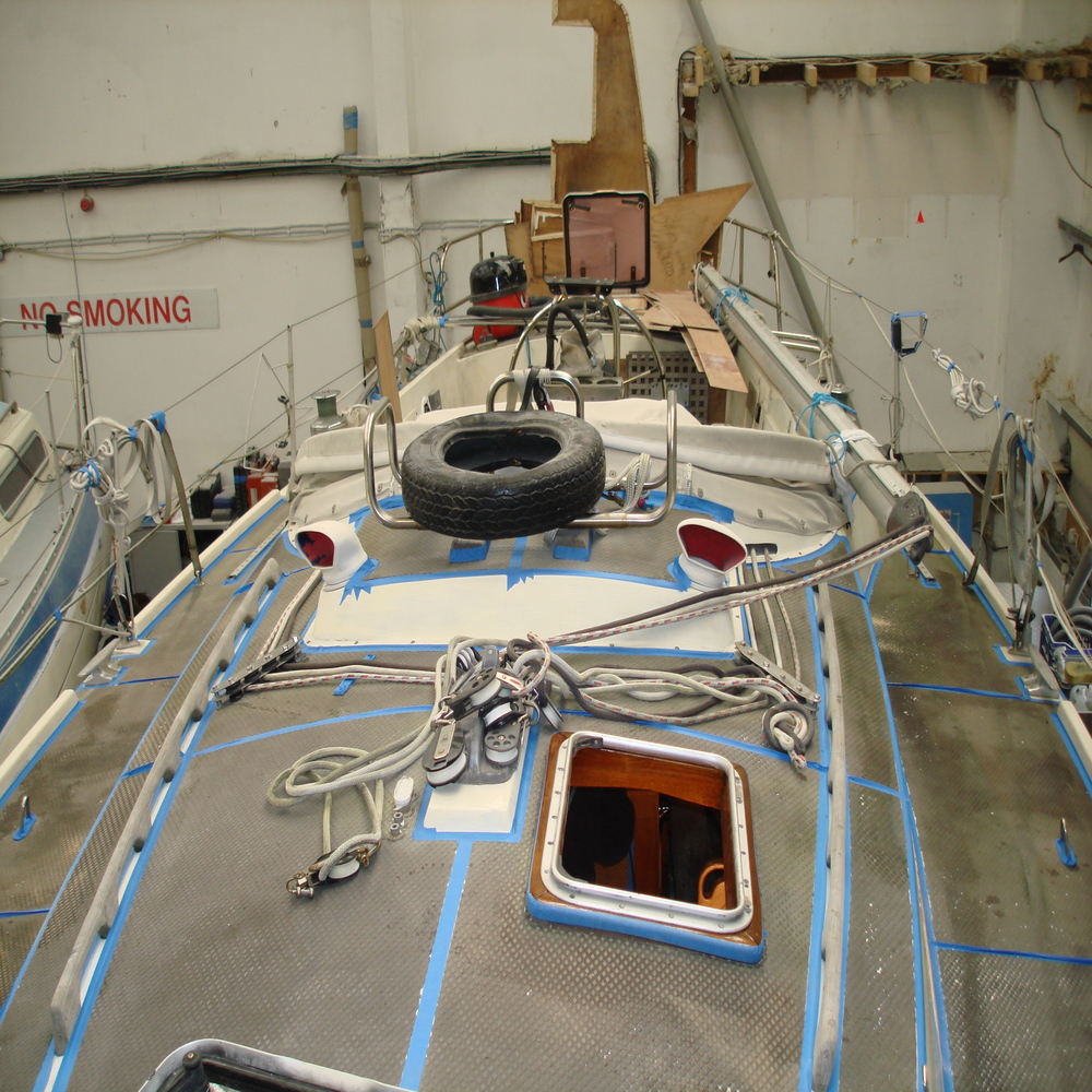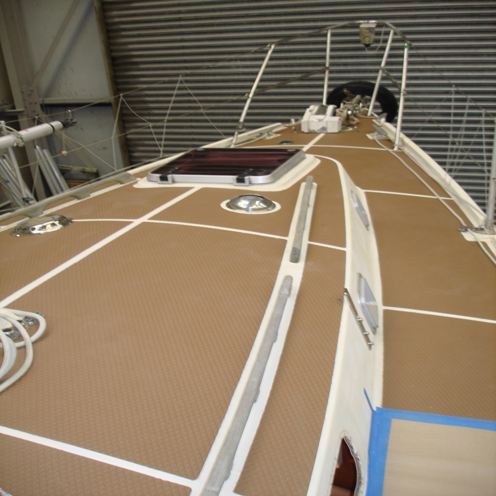 The tread on the deck was looking dull and faded, so first we gave all the tread a good clean with Treadmaster cleaner, we followed this up with the application of Treadcote paint, the colour used here was fawn.