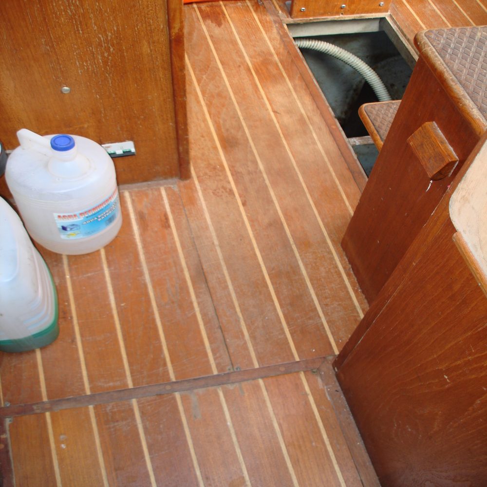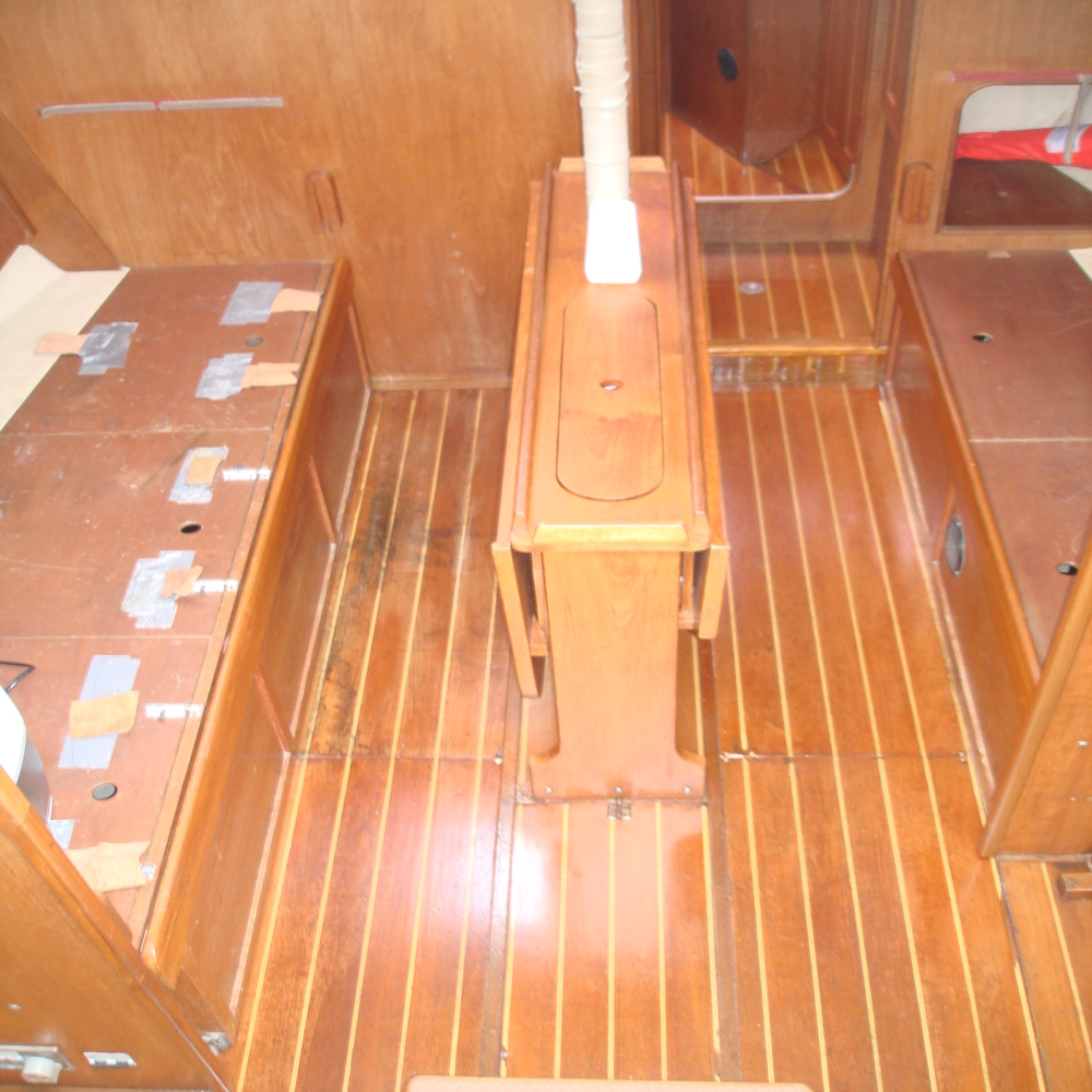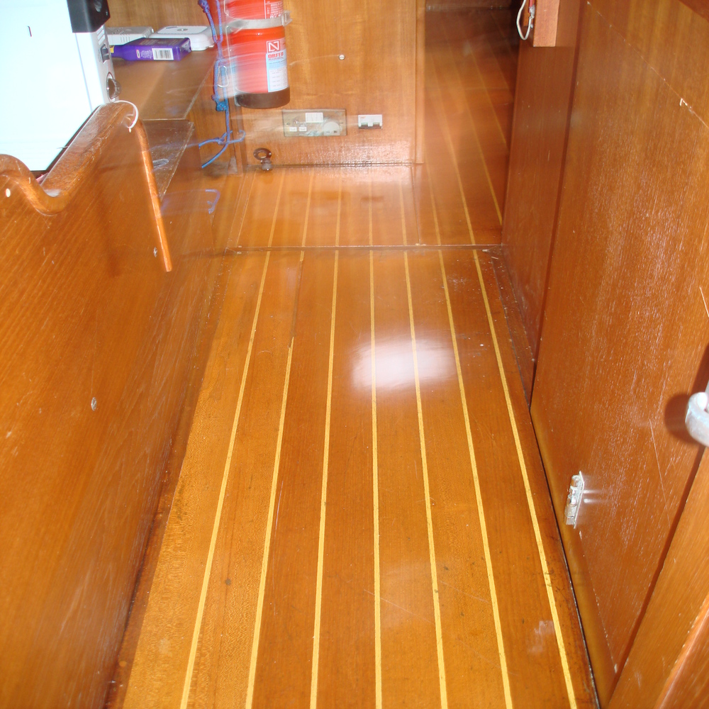 The flooring in the saloon and the cockpit stairs were in need of some TLC, so we removed all the loose flooring, taped up ready for sanding, sanded then applied 6 coats of varnish.