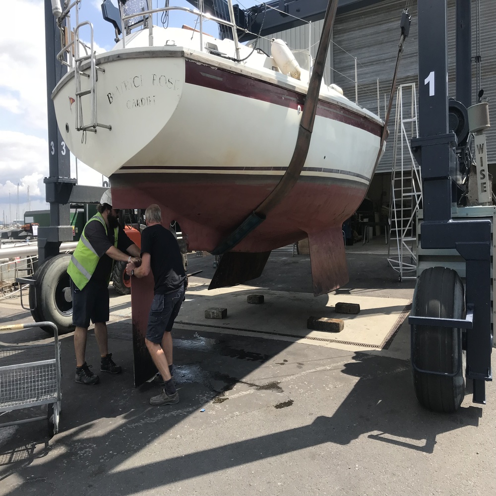 With the yards assistance we lifted the boat to remove the rudder, upon removal of the rudder all bearing and seals were checked, this discuss needed a new upper and lower bearing set and a new lip seal, all of which we supplied and fitted.